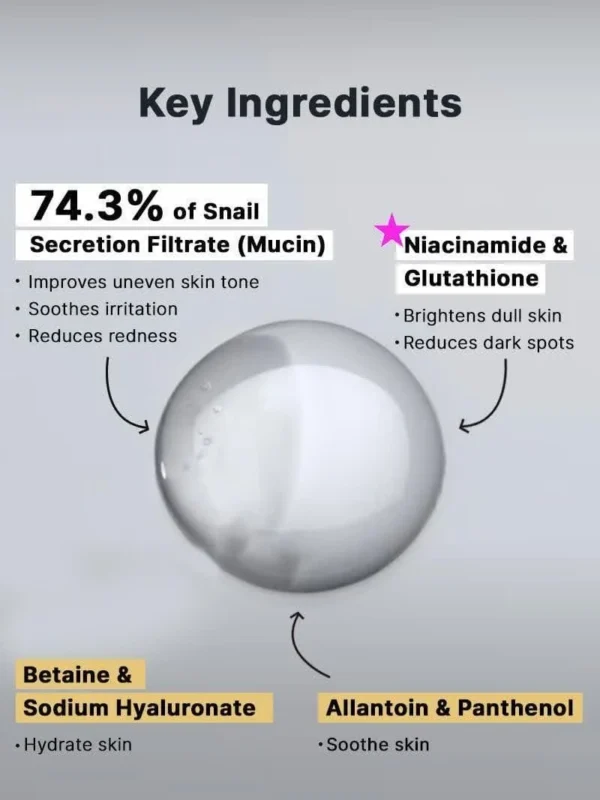 1.حاوی 74% ترشح حلزون که به بازسازی و تقویت سد دفاعی پوست کمک بسیاری میکند.